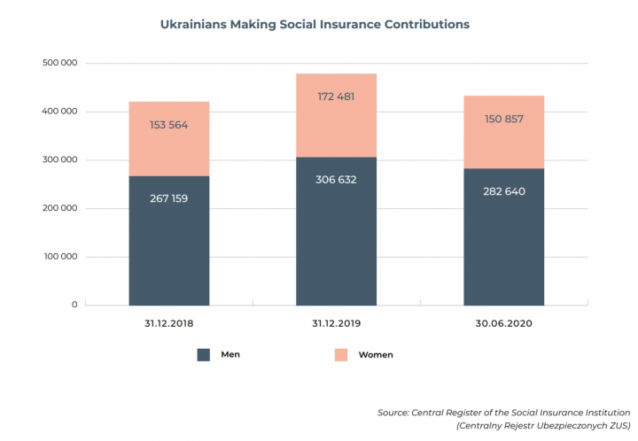 На конец 2019 года социальные взносы платили 479 113 украинцев в Польше. По сравнению с 2005 годом количество украинцев – плательщиков соцвзносов выросло в РП в 29 раз.