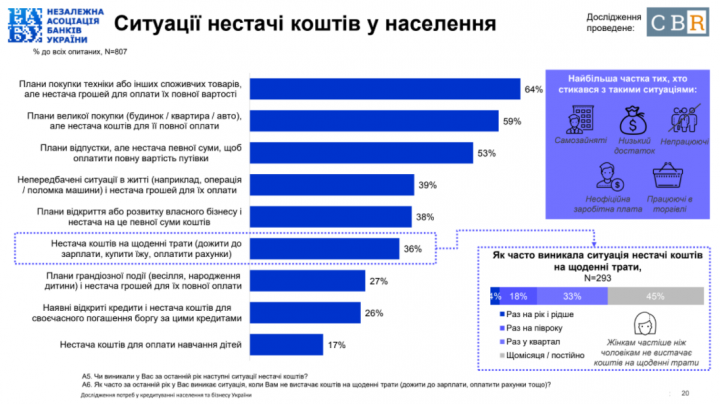 С ситуацией, когда не хватает средств, за последний год регулярно сталкиваются 45% украинцев. В то же время половина опрошенных заявила, что у них такие ситуации бывают почти ежемесячно. Чаще всего им не хватает денег на потребительские товары, дом/квартиру/авто и отпуск.