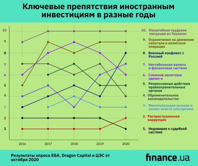 “Впервые за пять лет опросов недоверие к судебной системе возглавило антирейтинг препятствий для иностранных инвестиций. Широко распространенная коррупция, лидер предыдущих лет, заняла второе место. Эти два препятствия являются важнейшими как для стратегических, так и портфельных инвесторов. Монополизация рынков и захват власти олигархами занимает третье место среди препятствий, хотя стратегическим инвесторам также существенно препятствует обременительное и нестабильное законодательство”, – говорится в пресс-релизе.