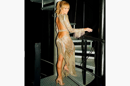 На размещенном в сети снимке 49-летняя знаменитость запечатлена в золотистом платье в пол с вырезами на спине и глубоким декольте. Наряд бренда Julien Macdonald выполнен из просвечивающего материала, за счет чего на фото видно, что Холден вышла в нем без белья. Она также надела телесные босоножки на каблуках. Публикация набрала больше 63 тысяч лайков.