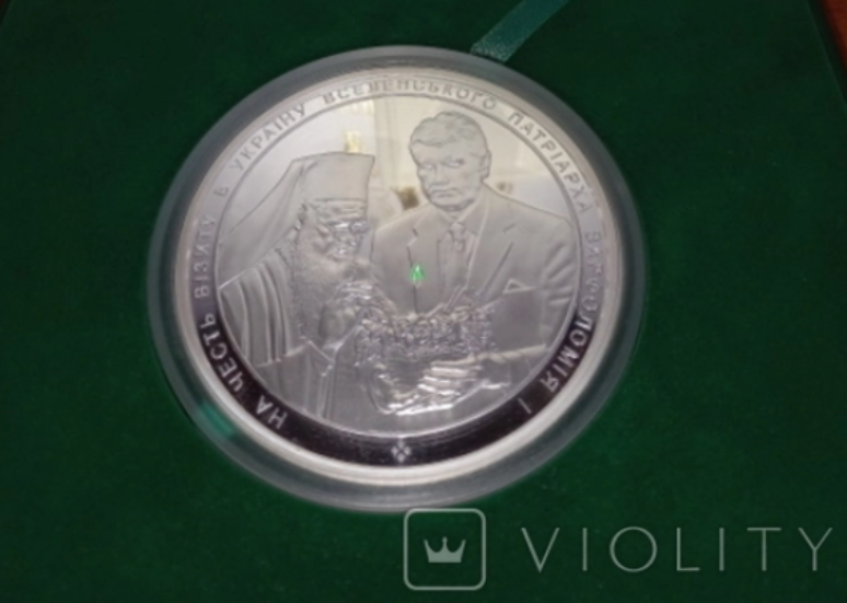 Масса монеты составляет 500 г, диаметр – 85 мм, тираж – до 1000 штук. Она была выпущена в 2008 году. Как известно, тогда Варфоломей посетил Украину в конце июля для участия в мероприятиях к 1020-й годовщине Крещения Руси. На монете, кроме Патриарха, изображен третий президент Виктор Ющенко.