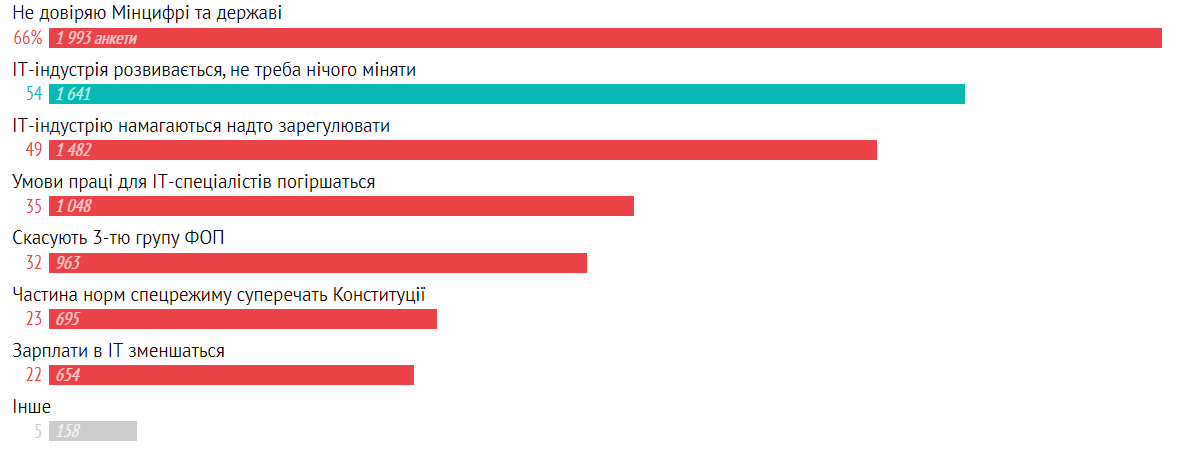 Снизилась доля тех, кто не поддерживает из-за недоверия к Минцифре — с 77% до 66%. На этот раз мы добавили вариант «ІТ-индустрию стараются чересчур зарегулировать», и он стал одним из самых популярных среди причин неподдержки.