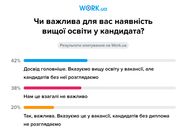 42% – что высшее образование — это, конечно же, хорошо, и в их вакансиях такой пункт присутствует, однако отзывы кандидатов без диплома они охотно рассматривают;