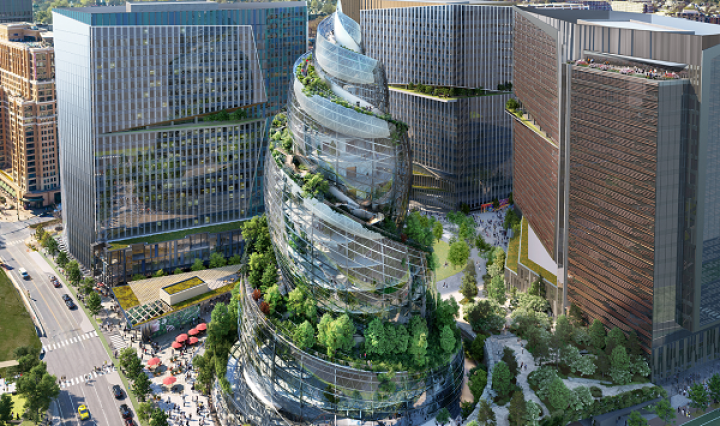 Amazon собирается построить новую штаб-квартиру в Арлингтоне, штат Вирджиния. Компания представила дизайн здания и оно, определенно, будет выделяться среди других. Штаб-квартира представляет собой закрученную стеклянную башню, покрытую деревьями, которая возвышается над линией горизонта. Amazon называет здание «Helix» (спираль), ведь его форма штопора вдохновлена «естественной красотой двойной спирали».