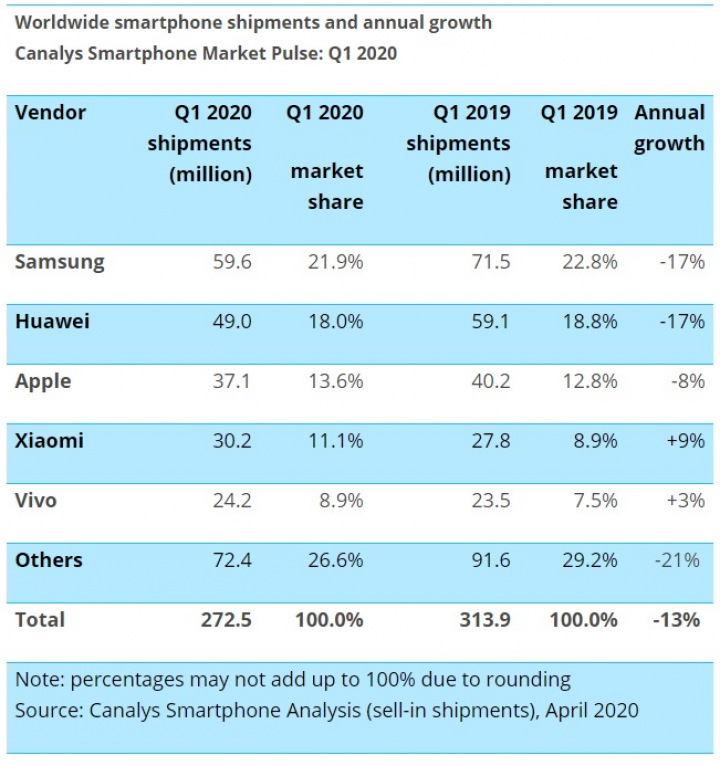 Примечательно, что выйти «сухой из воды» удалось лишь Apple, падение продаж которой по сравнению с прошлым годом составило 0,4%. В абсолютном выражении американская компания продала 38 миллионов устройств, а пандемия практически не повлияла на бизнес Apple, который занимает 13% всего рынка. Китайский производитель электроники Xiaomi, занимающий четвёртую строчку среди компаний с самым большим количеством реализованных устройств, сократил свои продажи на 21,5%.