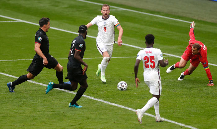 Игра стала живее, немцы шли спасать ситуацию, но нарвались на контратаку. Шоу перехватил мяч, отдал налево на Грилиша, который переправил на линию вратарской, где Кейн головой забил свой первый гол на Евро-2020.