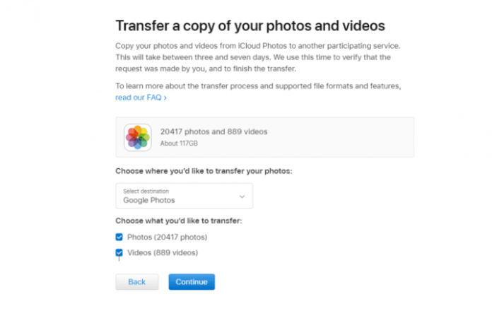 Например, если пользователь хочет скопировать 117 Гб данных из более 20 тысяч фотографий и более 800 видео, то ему потребуется подождать от 3 до 7 дней на завершение процесса переноса.