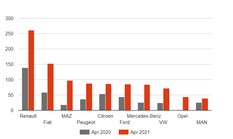 По сравнению с прошлым годом количество апрельских регистраций грузовых и специальных автомобилей выросло почти в два с половиной раза.