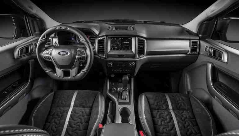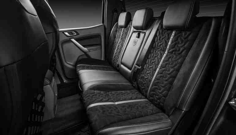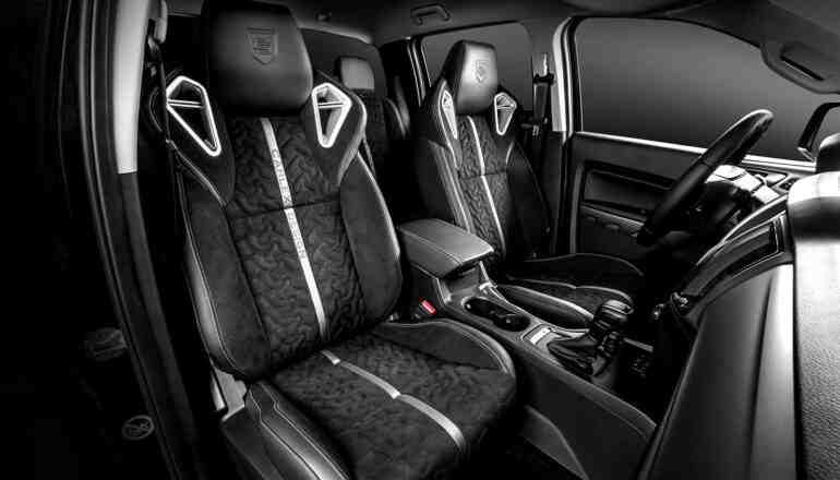 Также Ford Ranger оснастили регулируемой подвеской, подножками и труб и фаркопом. Специалисты ателье переработали и салон пикапа. Сидения отделали черной кожей и алькантарой с серебряными акцентами и аналогичной прострочкой. В такой же стилистике обшит руль Ford Ranger. Для большего комфорта тюнеры удлинили нижнюю часть сидений.