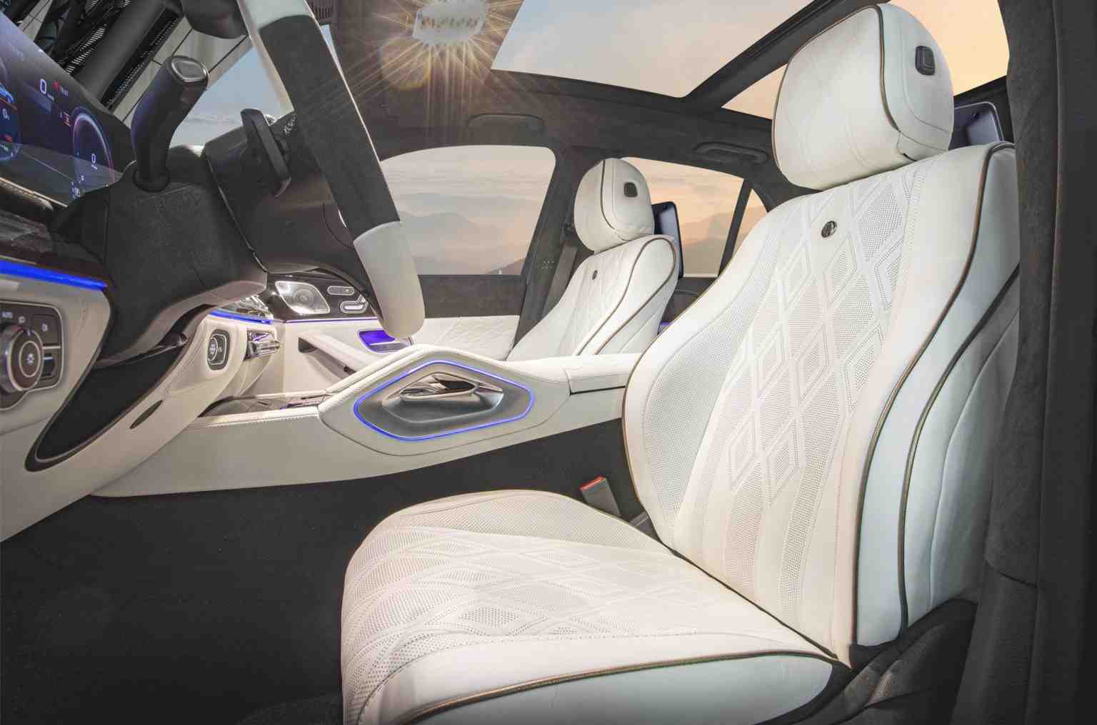 Салон кроссовера также был переработан специалистами ателье. Тюнеры заменили задний диван на два кресла с консолью посредине. Все поверхности интерьера отделаны белоснежной перфорированной кожей Nappa и алькантарой, которую дополняет контрастная строчка. Багажное отделение облицовано алюминием, а пол отделан деревом.