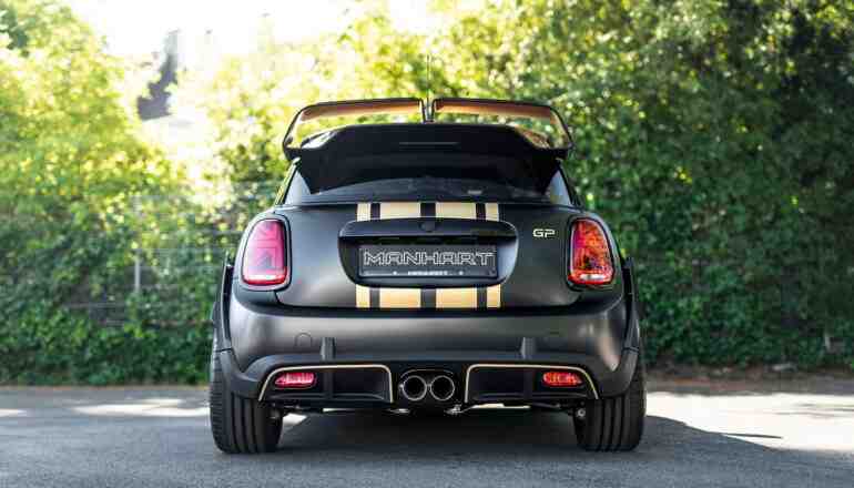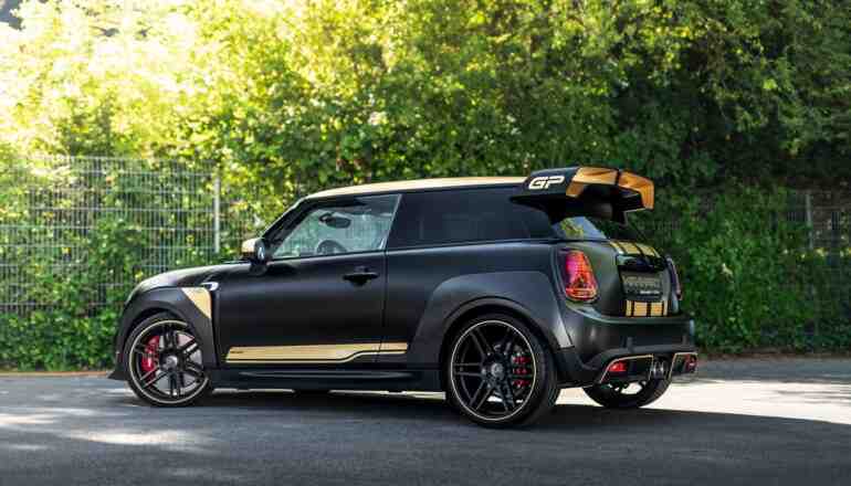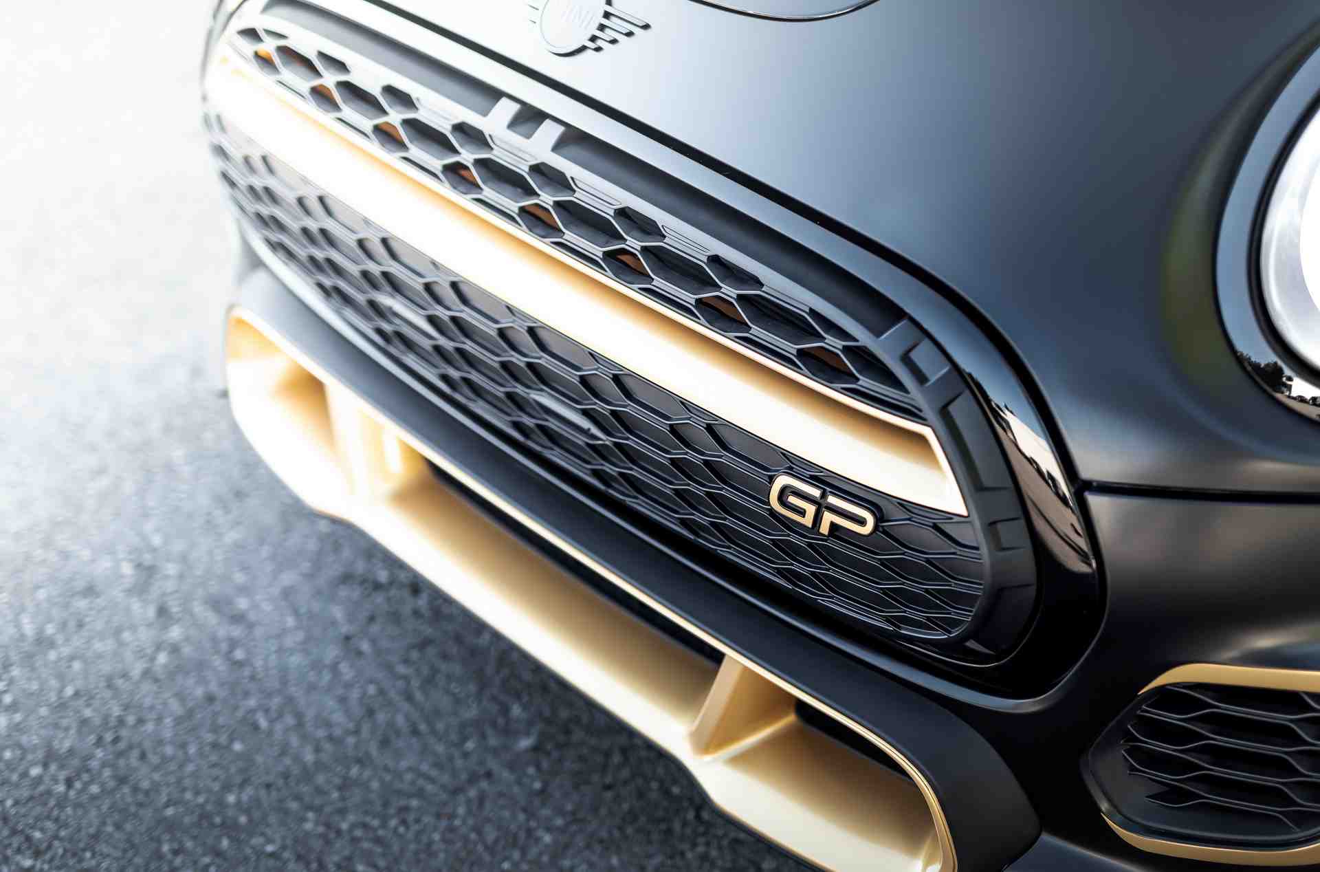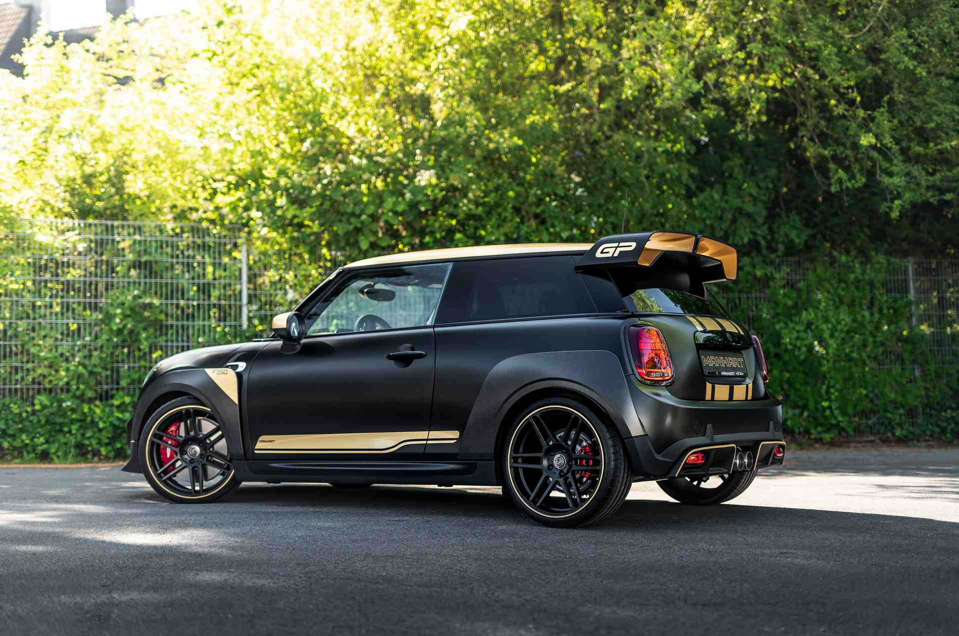Кузов MINI JCW GP обтянули черной матовой пленкой, которая контрастирует с золотистыми полосами и акцентами. Также хэтчбек получил большое заднее антикрыло, расширенные колесные арки, 19-дюймовые колесные диски Manhart Concave One и переработанную подвеску AST, которая занижает дорожный просвет на 20 мм впереди и 15 мм сзади.