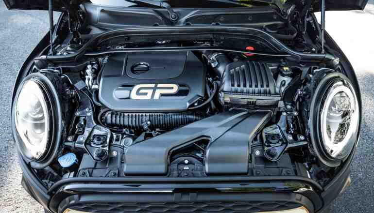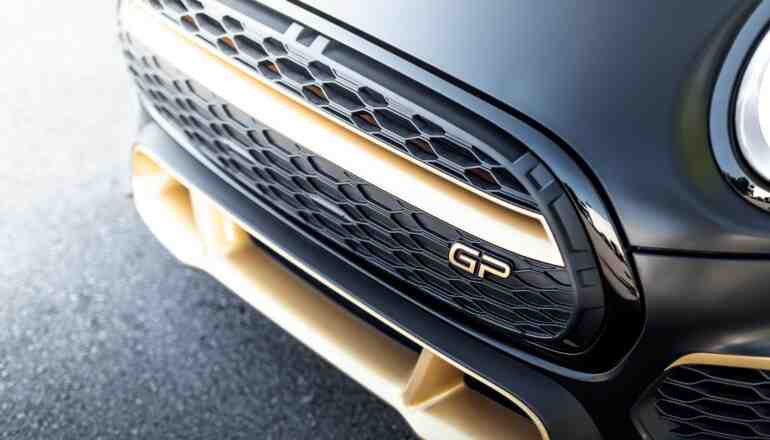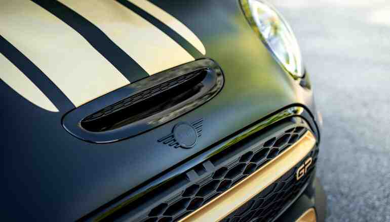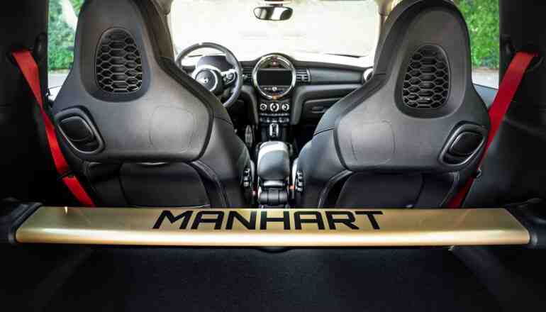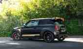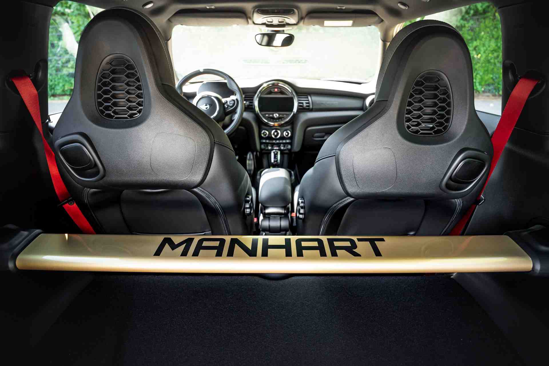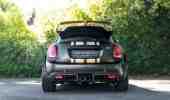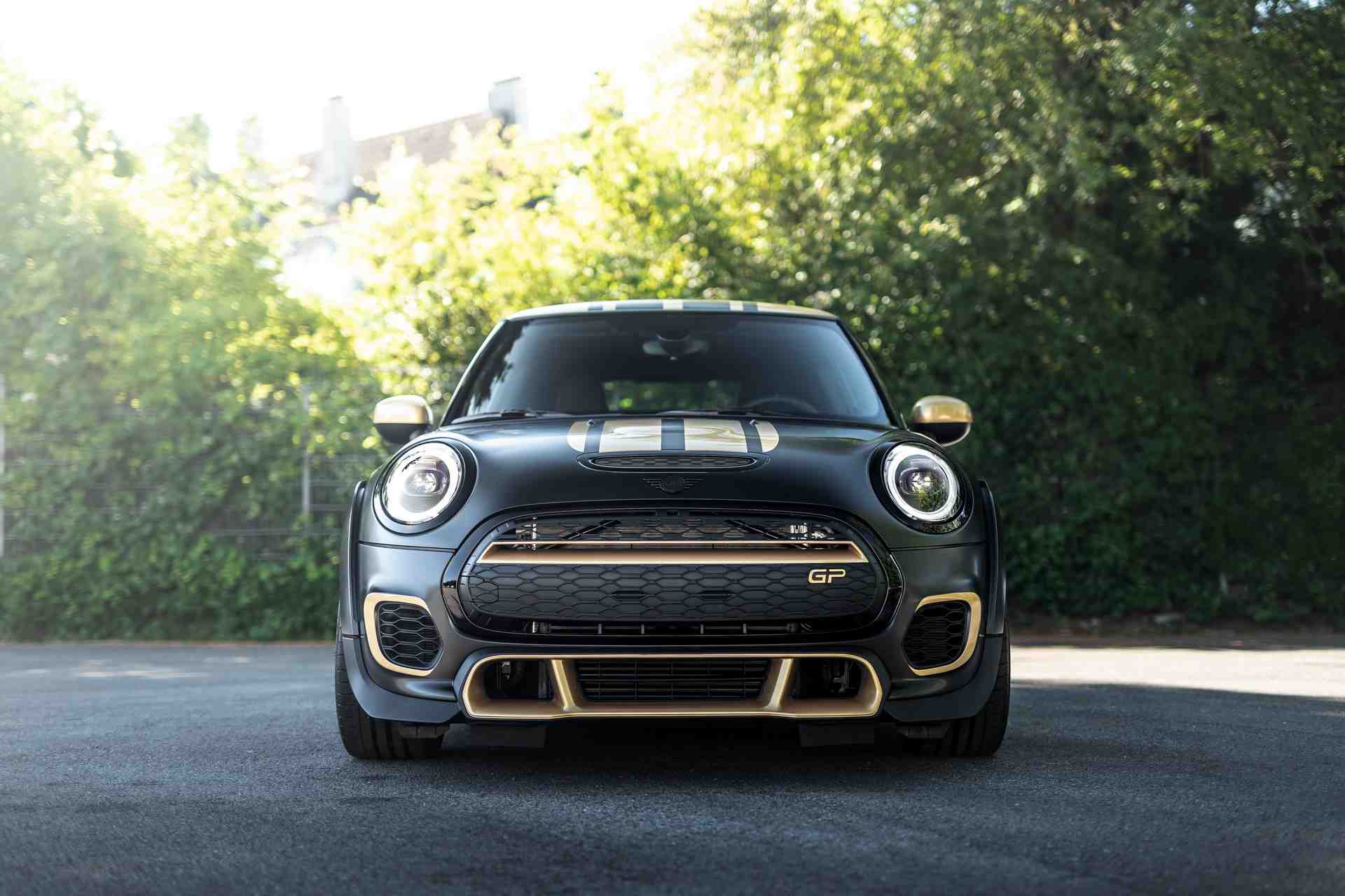 Кузов MINI JCW GP обтянули черной матовой пленкой, которая контрастирует с золотистыми полосами и акцентами. Также хэтчбек получил большое заднее антикрыло, расширенные колесные арки, 19-дюймовые колесные диски Manhart Concave One и переработанную подвеску AST, которая занижает дорожный просвет на 20 мм впереди и 15 мм сзади.