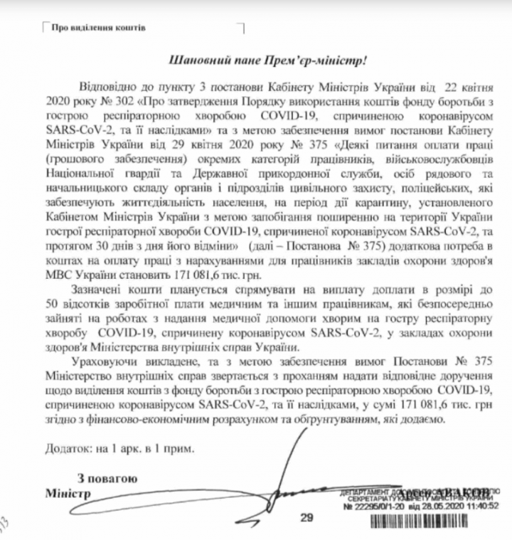 В мае Министерство внутренних дел официальным письмом обратилось к премьер-министру Денису Шмыгалю с просьбой о предоставлении 2,5 миллиарда гривен на доплаты полицейским, нацгвардейцям и пограничникам на время карантина.