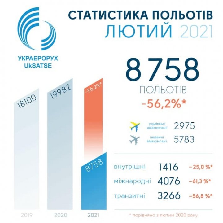 В феврале «Украэрорух» обслужил 8 758 рейсов, украинские авиакомпании выполнили 2 975 рейсов (на 51,7% меньше, чем в феврале прошлого года), иностранные — 5 783 рейса (- 58,2%).