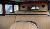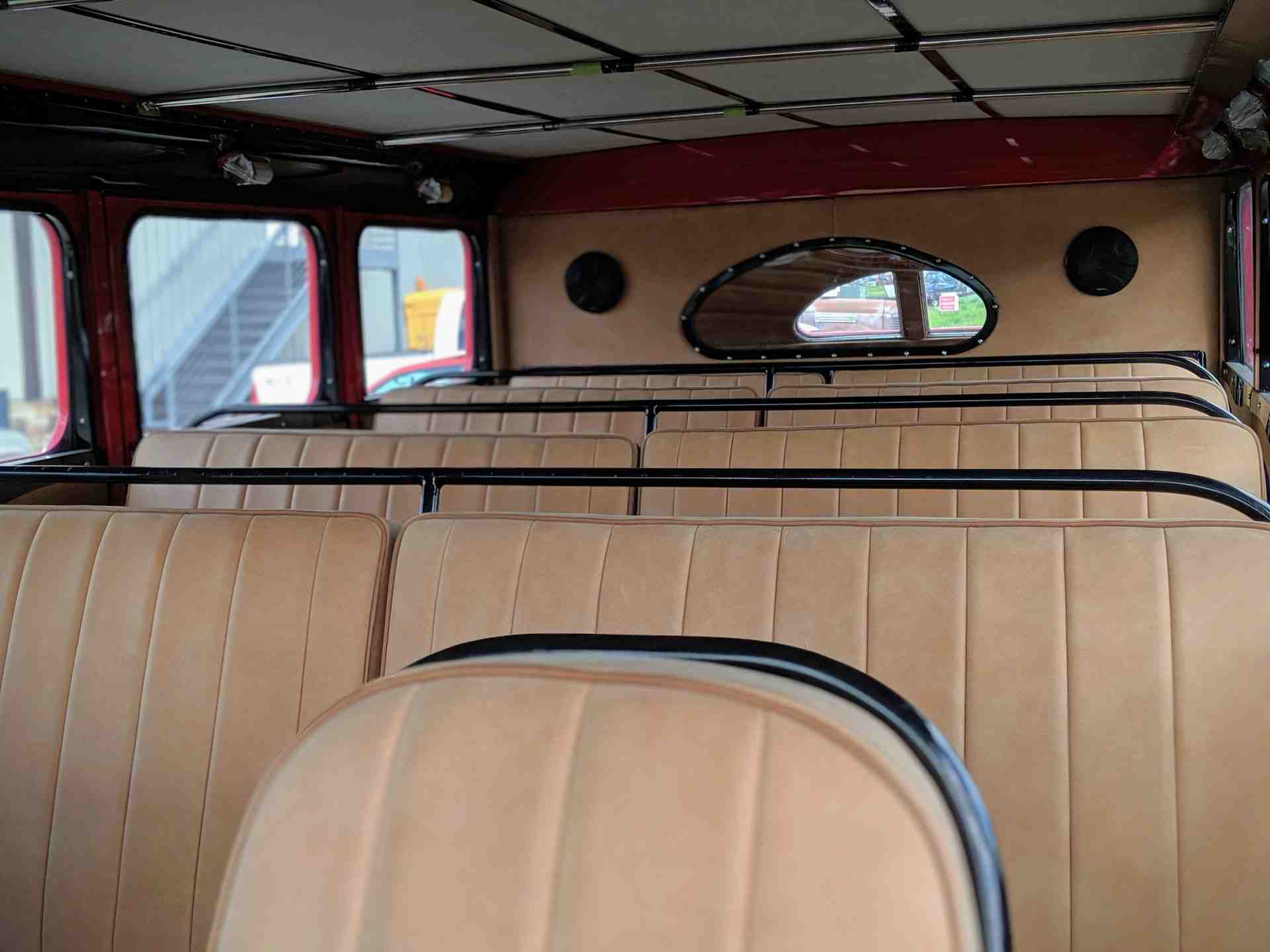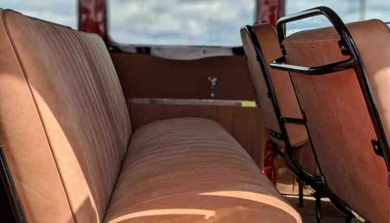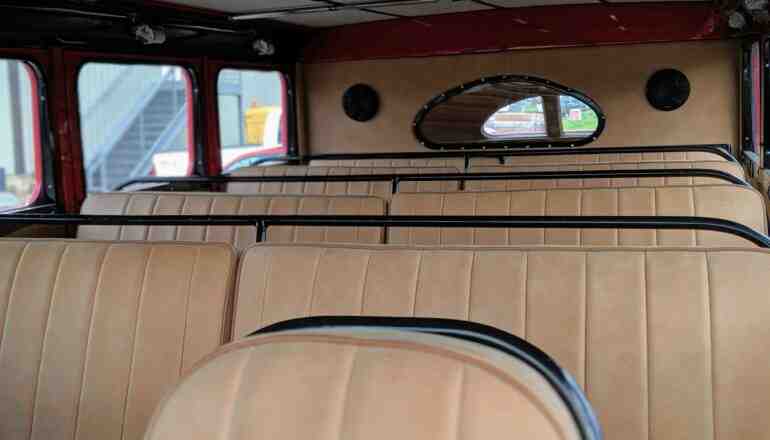 Особо много времени заняла реставрация интерьера. Здесь не только восстановили щиток приборов и оригинальные плафоны освещения, но также перетянули натуральной итальянской кожей все сиденья. Так что теперь все 18 пассажиров гарантировано обеспечены надлежащим уровнем комфорта. Такое внимание мастеров к сиденьям было вызвано еще и тем, что салон автобуса хорошо просматривается через сдвижную мягкую крышу, а посему должен иметь идеальное состояние.