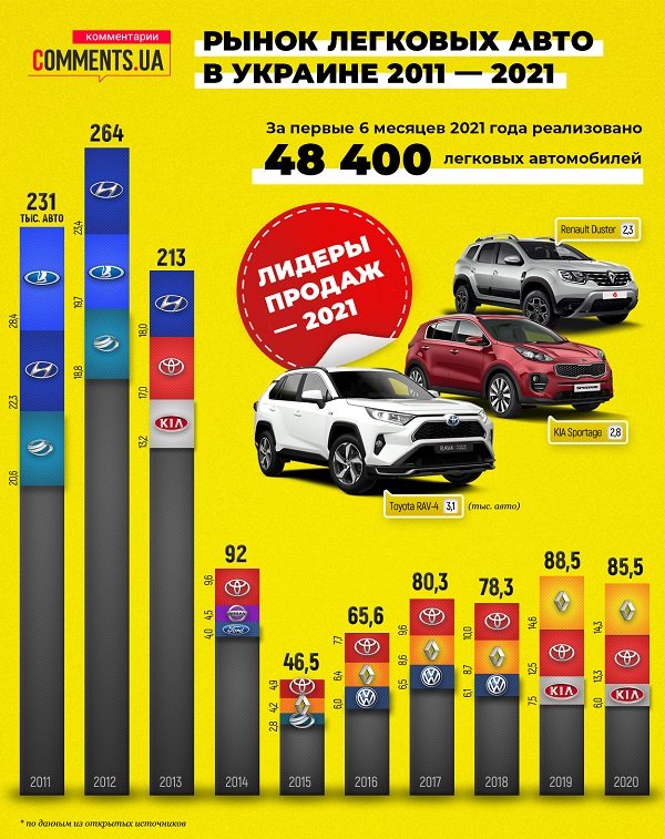 За первое полугодие 2021 года было реализовано 48,4 тысячи новых легковушек, что почти на треть больше, чем за аналогичный период прошлого года. ТОП-5 самых популярных моделей пока выглядит следующим образом: Toyota RAV-4 с показателем продаж в Украине — 3,1 тысячи новых машин; практически не уступающий японцам южнокорейский кроссовер KIA Sportage (2800 проданных экземпляров); две модели от Renault — Duster (2300) и Sandero (1500) и Nissan Qashqai (1400 авто).