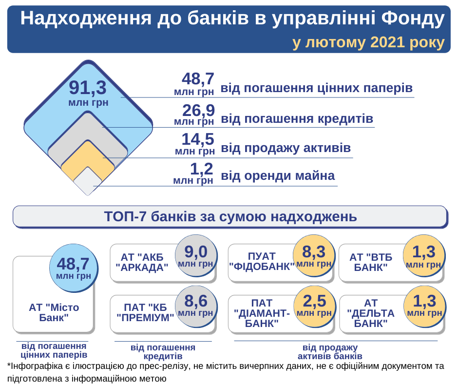 В течение февраля на счета неплатежеспособных банков, находящихся в ликвидации и управлении Фонда гарантирования вкладов, поступило 91,3 млн грн.