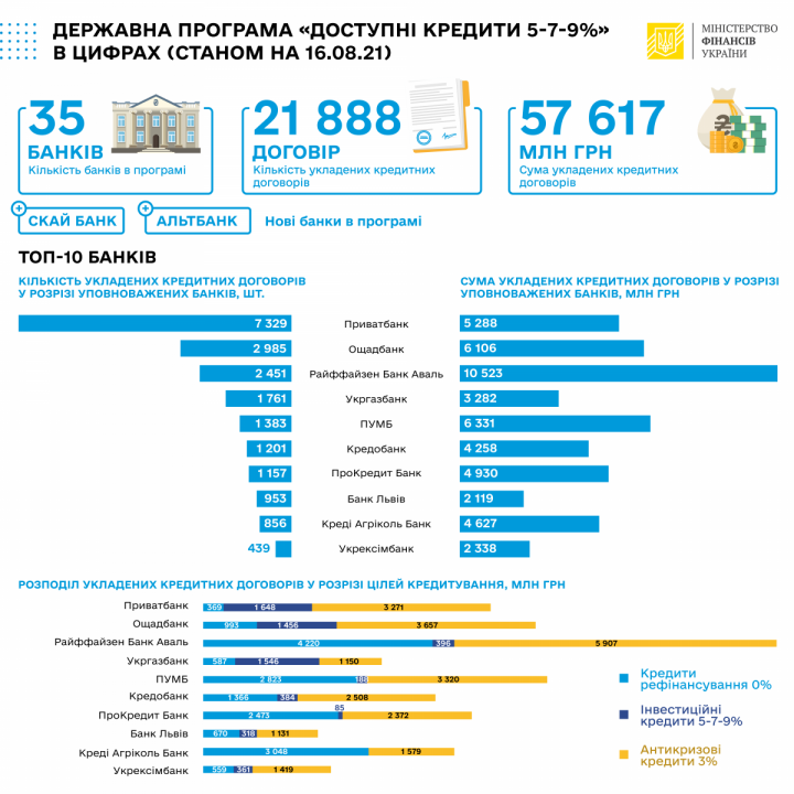 Уполномоченные банки с момента старта программы “Доступные кредиты 5-7-9%” по состоянию на 16 августа 2021 выдали кредитов на общую сумму 57,6 млрд грн, из них на прошлой неделе – 899 млн гривен.