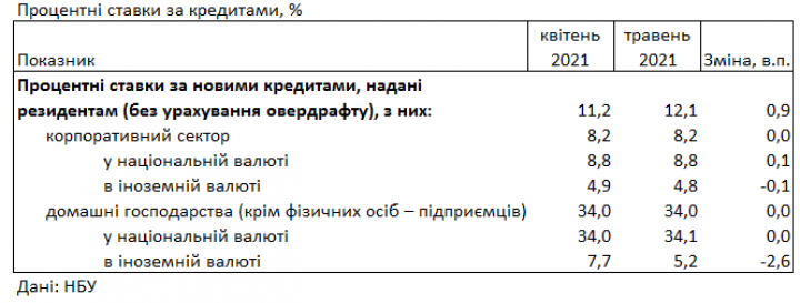 Ставки по гривневым кредитам для предприятий за май не изменились – 8,8% годовых, по валютным снизились на 0,1 п.п. до 4,8% годовых.
