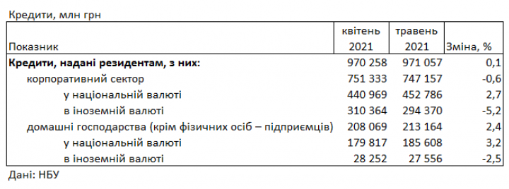 Кредитный портфель банков за май 2021 год вырос на 0,1% до 971 млрд грн, в т.ч. населения вырос на 2,4% до 213 млрд грн, предприятий сократился на 0,6% до 747 млрд грн.