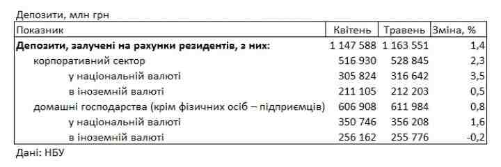 Депозитный портфель банков в мае вырос на 1,4% до 1163 млрд грн, в т. ч. населения вырос на 0,8% до 611 млрд грн, предприятий вырос на 2,3% до 528 млрд грн.