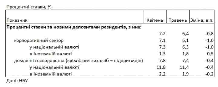 В мае 2020 года ставки по гривневым депозитам для предприятий снизились с 7,3% до 6,3% годовых, по валютным – выросли с 1,3% до 1,8% годовых.