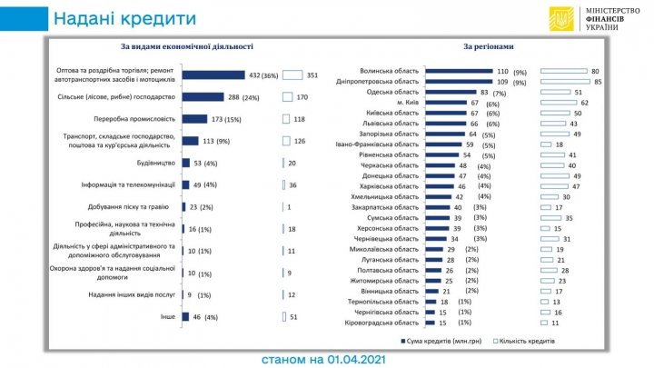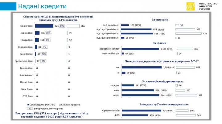 По состоянию на 1 апреля по государственным гарантиям на портфельной основе банки выдали 891 кредит бизнесу на 1 193 млн грн.