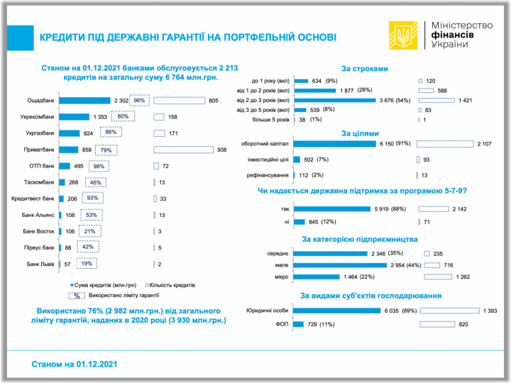 По состоянию на 1 декабря по государственным гарантиям на портфельной основе 11 банков предоставили бизнесу 2213 кредитов на общую сумму 6,764 млрд грн.