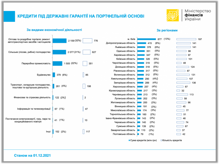 По видам экономической деятельности больше всего кредитов, частично обеспеченных госгарантиями на портфельной основе, выдано в сферах оптовой и розничной торговли (776 на 2,16 млрд грн), сельского хозяйства (627 на 2,77 млрд грн) и перерабатывающей промышленности (337 на 1,5 млрд грн).