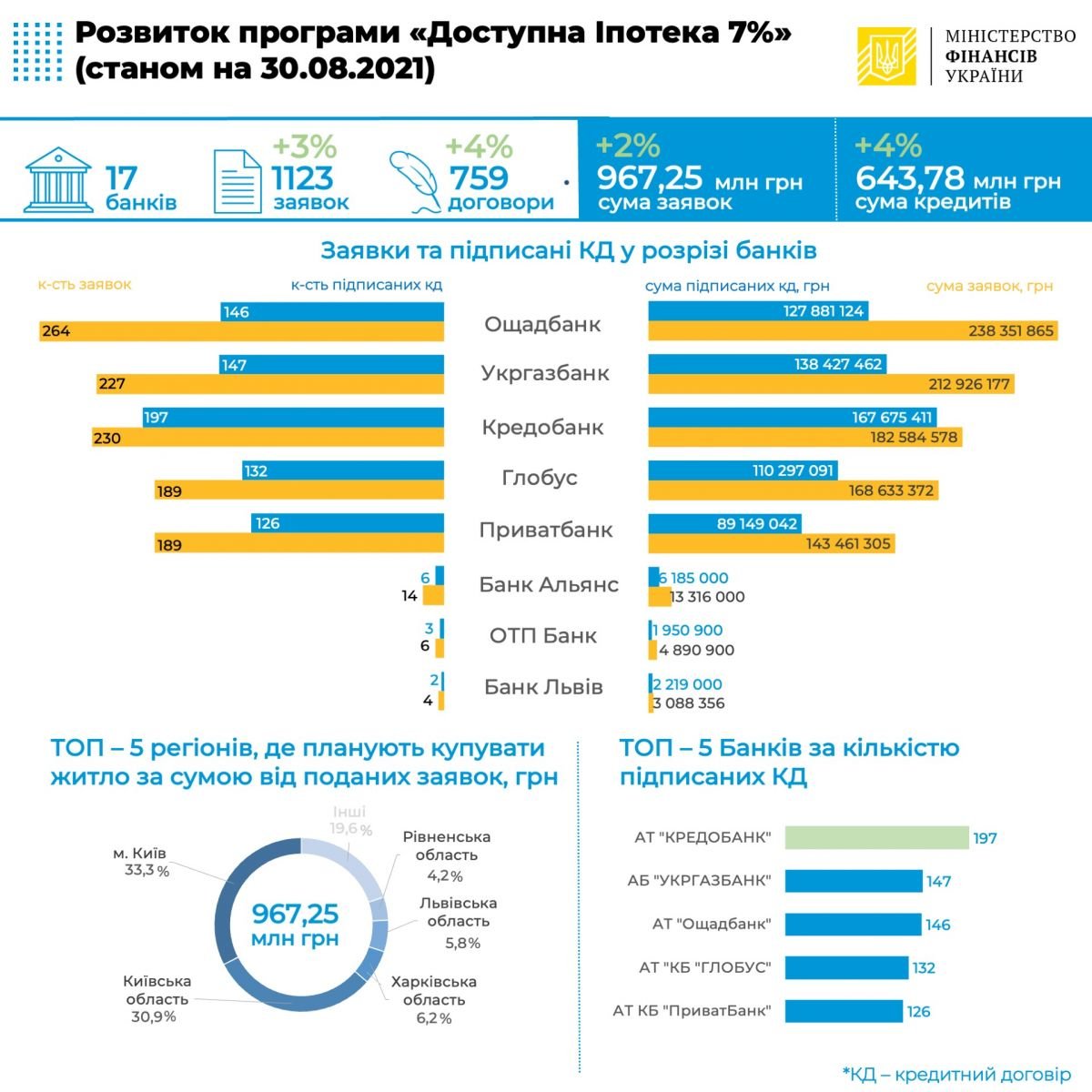 По состоянию на 30 августа уполномоченные банки подписали 759 кредитных соглашений на 643,78 млн грн в рамках госпрограммы «Доступная ипотека 7%».