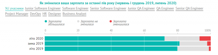 Интересно, что среди разработчиков худшая динамика у Senior SE: 8% указали, что зарплата снизилась, когда в 2019-м таких было менее 2%. Для сравнения, у Junior SE зарплата уменьшилась в 4% респондентов. Самый высокий процент среди тех, у кого уменьшилась зарплата, у HR и Designer – почти 10%.