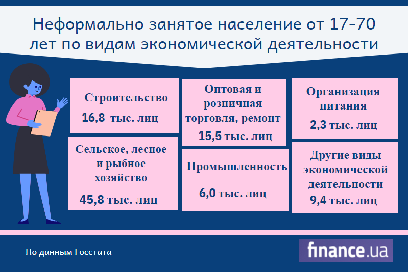 Наибольший процент неформально занятых в сельском хозяйстве — 45,8%, в строительстве — 16,8% и в торговле — 15,3%. В промышленности доля неформальной занятости составляет 6,0%.