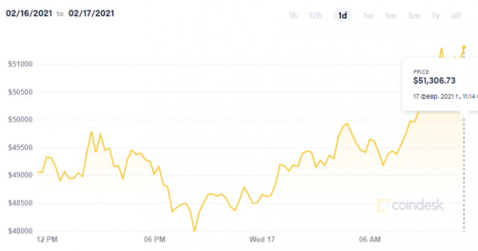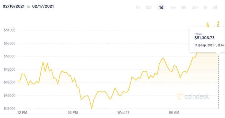 Стоимость Bitcoin во среду, 17 февраля, превысила уровень 51 тысячу долларов и достигла 51 348 долларов. Только в этом месяце цена выросла на 53%.