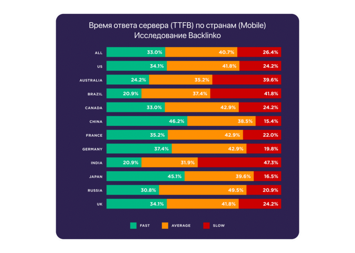 Сейчас ситуация в этом плане улучшилась. По данным Backlinko, десктопные версии сайтов из РФ по скорости загрузки не уступают французским или британским, а от американских отстают незначительно. Но вот статистика по мобайлу похуже. Тут российские сайты отстают не только от американских, но и от европейских.