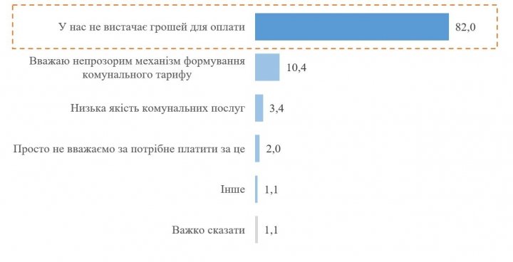 82% остановились на варианте «У нас не хватает денег на оплату». 10,4% – на ответе «считаю непрозрачным механизм формирования коммунального тарифа», еще 3,4% отметили низкое качество коммунальных услуг. Вариант «Просто не считаю нужным платить за это» выбрали 2% опрошенных. По 1,1% украинцев выбрали другой вариант или затруднились с ответом.