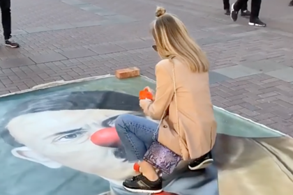 На кадрах видно, как прохожие разрисовывают портрет, закидывают его яйцами, выливают алкоголь, режут на части и топчутся. Кто-то из людей положил на рисунок Библию и мягкие игрушки. Вскоре на место случившегося подъехал автомобиль полиции.