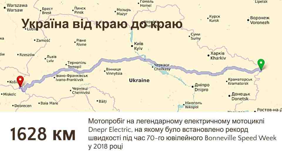 Президент Киевского городского автомотоклуба – известный спортсмен Сергей Малик готовится установить новый рекорд на электробайке Dnepr Electric. На этот раз это произойдет не за океаном, а на нашей родной земле. Сергей собирается на мотоцикле пересечь Украину с востока до запада, преодолев 1628 км. На официальной страничке гонщика в Фейсбук размещена уже и карта с предполагаемым маршрутом.