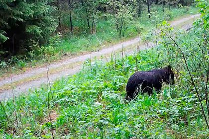 На кадрах можно заметить двух медведей — один большой, второй поменьше. Они по очереди посетили заросли вокруг тропинки.