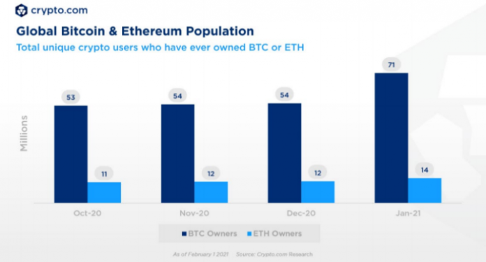 По оценкам Crypto.com, в январе биткоином владели 71 млн пользователей, Ethereum — 14 млн пользователей. За этот период аудитория выросла на 30,2% и 13,1% соответственно.