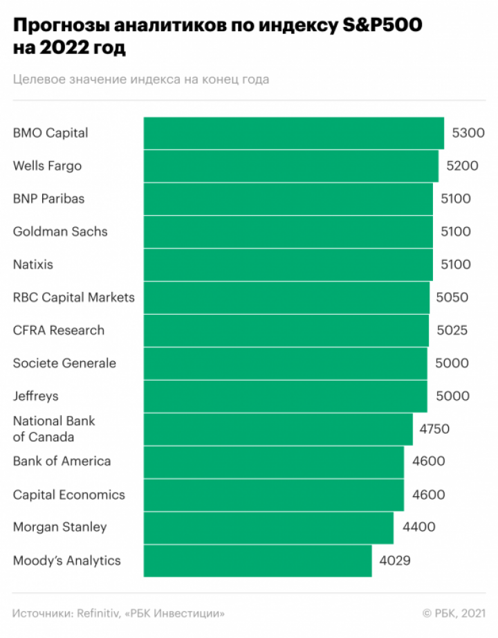 Диапазон оценок аналитиков Уолл-стрит по индексу S&P500 на конец 2022 года, собранный Refinitiv, составляет от 4029 до 5300 пунктов. Часть экспертов считает, что текущие оценки фондового рынка США завышены, и ждут падения индикатора в 2022 году, однако многие аналитики Уолл-стрит настроены оптимистично и прогнозируют новые рекорды.
