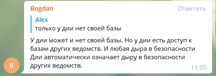 А вот подписчики нашего телеграм-канала Bogdan и Di утверждают, что даже это не может гарантировать безопасность данных украинцев, поскольку базы «Дії» подвязаны к базам других ведомств – то есть любая утечка может отразиться на сохранности данных пользователей.