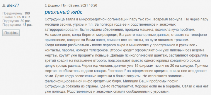 Еще один активный пользователь форума alex77 поделился реальным кейсом о том, как МФО “заразила” телефон заемщика вредоносным ПО, которое “сливало” контакты с телефона пострадавшей и ее местоположение. Однако на этом “схема” не заканчивалась.