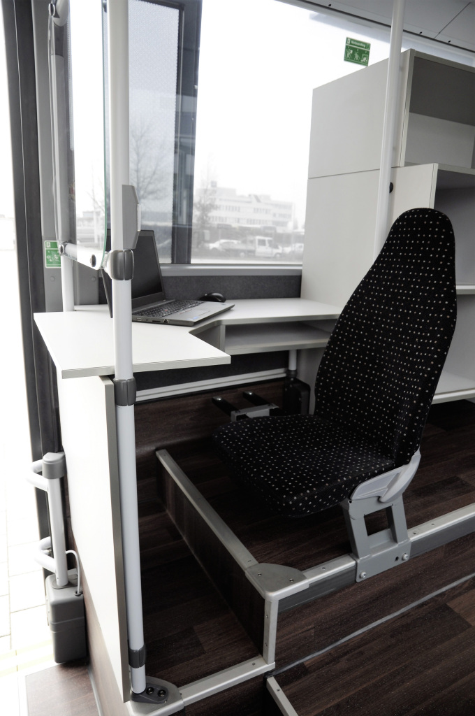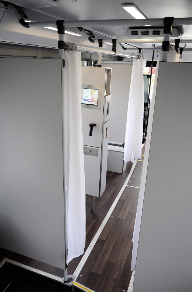 Четыре кабинки для вакцинации находятся в передней части 12,3-метрового автобуса и оборудованы сиденьями. Между кабинками расположены консоли, которые были специально приспособлены к процедуре вакцинации. Они имеют мониторы и недавно разработанные сменные носители для самих инъекций. Выдвижные ящики могут быть использованы для укладки приготовленных прививок, причем цветные носители используются для дифференциации различных типов. Альтернативно, они также могут быть использованы для укладки других медицинских материалов, таких как пластыри.