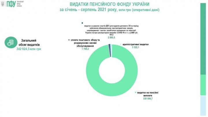 Доходы Пенсионного фонда Украины за январь-август 2021 года составили 330,0 млрд гривен, расходы – 342,9 млрд гривен.