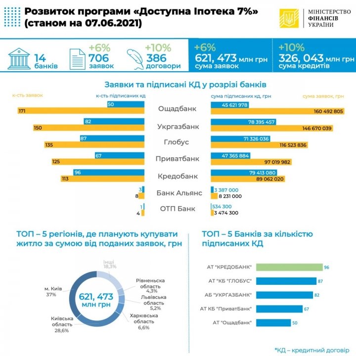 Уполномоченные банки в рамках государственной программы «Доступная ипотека 7%» заключили 386 кредитных договоров на сумму 326 млн гривен. В то же время в мае в Украине начался прием заявок на льготную ипотеку.