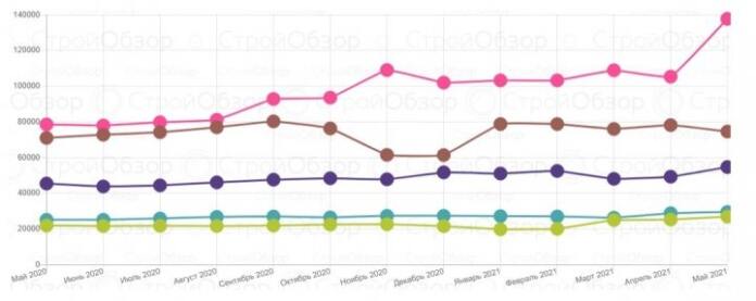 с «комфортом» ситуация похожая. С осени 2020-го и последующие полгода колебания цены хоть и было, но не таким резким, как последние три месяца. В мае цена поднялась на 2,4% и составила 29 547 грн. за «квадрат»;