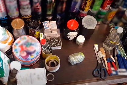 На кадрах видны компоненты для изготовления взрывного устройства, разные емкости с горючими веществами. Свидетели сообщили следователям о месте, где задержанный испытывал свои изобретения. В ходе осмотра удалось обнаружить неразорвавшееся взрывное устройство и поражающие элементы из сработавших устройств.