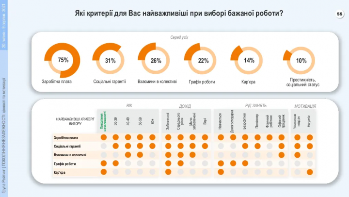 При выборе желаемой работы важнейшим критерием для украинцев является заработная плата (75%), далее идут социальные гарантии (31%), взаимоотношения в коллективе (26%) и график работы (22%).
