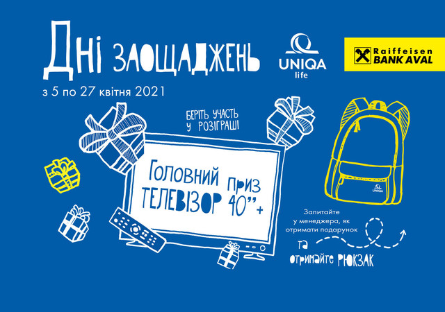В отделении Райфа Вам помогут выбрать лучшие условия страхования, поделятся с вами праздничным настроением и гарантированным подарком (рюкзаком), кроме того, Вы сможете принять участие в розыгрыше главного приза от Райфа и Уника Жизнь – телевизора с диагональю 40+ “*.