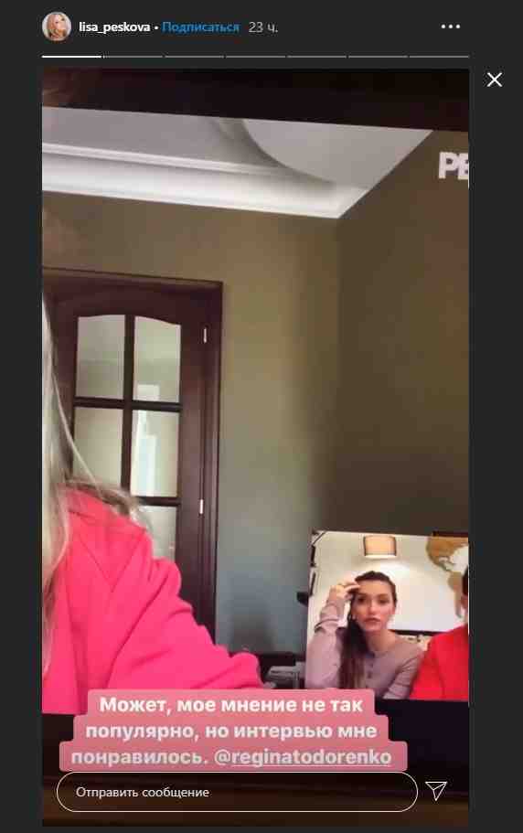 Дочери пресс-секретаря президента Дмитрия Пескова Елизавете понравилось скандальное интервью ведущей «Орла и решки» Регины Тодоренко, в котором она обвинила жертв домашнего насилия в том, что их бьют. Об этом Пескова написала в своем Instagram.